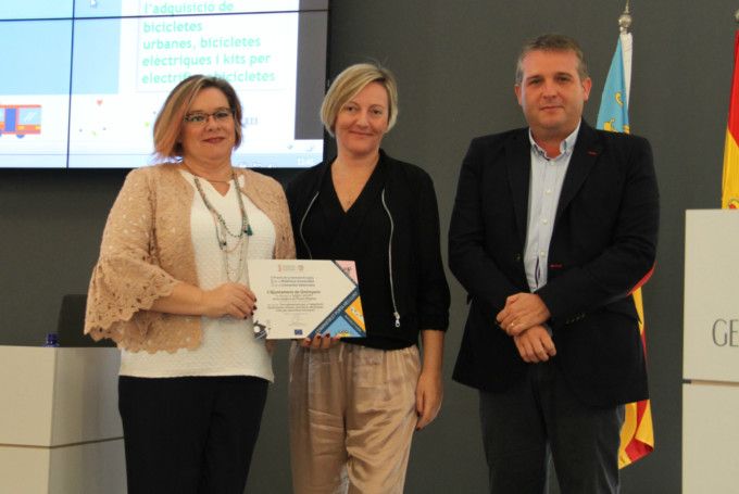 La concejala de Sostenibilidad, Patricia Folgueras, acompañada del concejal coordinador de Territorio, Jaime Peris, recogía este martes en la Ciudad Administrativa 9 d’octubre uno de los galardones que la Conselleria otorga dentro de los II Premios de la Semana Europea de la Movilidad. Concretamente ha sido el 2º Premio en la categoría de municipios de entre 20.000 y 50.000 habitantes, en reconocimiento al desarrollo del programa municipal de subvenciones para la adquisición de bicicletas urbanas, bicicletas eléctricas y kits para electrificarlas.