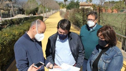 Jorge Rodríguez visitaba este jueves las obras acompañado por los regidores Joan Sanchis (Territorio), Sayo Gandia (Sostenibilidad) y Manuel Cuesta (Servicios Municipales), en un recorrido en el que se constataba que 3 de los 7 tramos en que se divide el proyecto de obra van a finalizar previsiblemente la próxima semana, pasando a ser abiertos para su uso y goce por parte de la ciudadanía. En concreto, en estos tramos (los más próximos a la pasarela que atraviesa la carretera CV-81) solo quedan algunos trabajos de pintura y señalización horizontal, después de haber finalizado ya las tareas de habilitación y acondicionamiento del pavimento del vial y la inclusión de los nuevos puntos de luz, elementos de jardinería y adaptación de los cruces al paso de bicicletas, entre otros trabajos ejecutados.