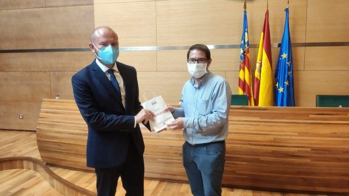 El Presidente de la Diputación de Valencia, Toni Gaspar, y la totalidad de los portavoces de los grupos políticos representados en la corporación valenciana )PSPV-PSOE, Compromís, PP, Ciudadanos, Vox y La Vall ens Uneix) ya tienen su mascarilla "Textil Ontinyent". El segundo teniente de alcalde ontinyentí, Joan Sanchis (también diputado provincial por el partido judicial de Ontinyent) las entregaba hoy coincidiendo con el pleno de la Diputación muestras de estas mascarillas higiénicas o de barrera, reutilizables y lavables, fabricadas bajo la norma UNE 0065:2020 en la ciudad.