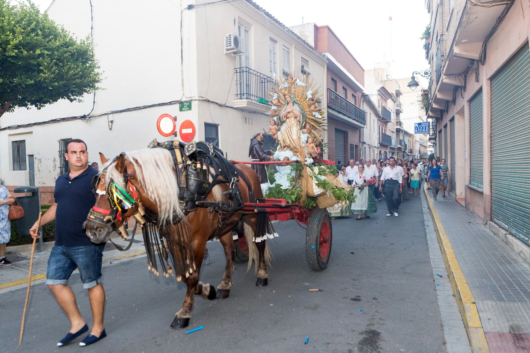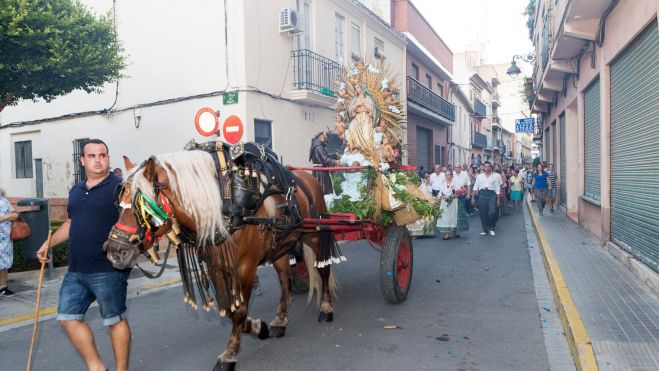 Este miércoles la Clavaría de Nuestra Señora de los Ángeles sacó la imagen de la patrona por las calles de Mislata. Lo hicieron como se ha hecho siempre, subida en un carro tirado por un caballo de los que se emplean para trabajar en la huerta. Por delante, más de un centenar de tiradores lanzan cohetes de lujo para abrir paso a la patrona.