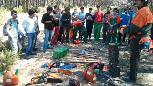 El trabajo de marcado se hace con equipos mixtos formados por alumnos de ambos centros. Una vez establecidos los árboles a aclarar, los alumnos de la escuela de Requena han procedido al apeo de los mismos, bajo la supervisión de los profesores Miguel Ángel Argilés y Benjamín Martínez, poniendo en práctica los conocimientos adquiridos en aula.