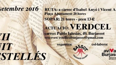 Por séptimo año consecutivo, Burjassot celebra hoy, sábado 3 de septiembre su particular homenaje al gran poeta, oriundo de la localidad, Vicent Andrés Estellés. Lo hace con la celebración de la VII Nit Estellés, una combinación de poesía, paseo, gastronomía y música, organizada por la Asociación Cultural Bassot de Burjassot, con la colaboración de AVIVA, la Agencia de Promoción del Valenciano de Burjassot, que dirige Maria Viu.