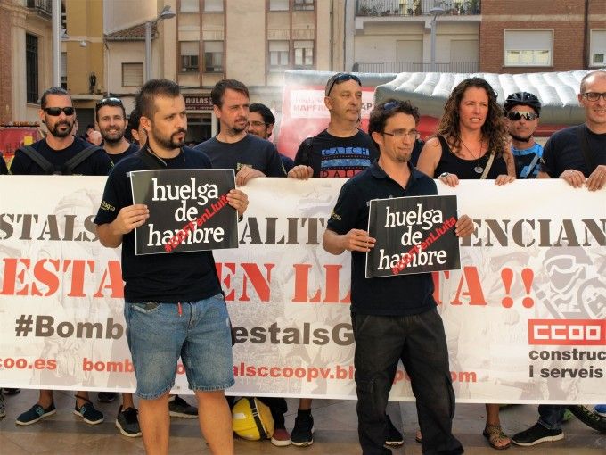 Dos bomberos forestales han iniciado este lunes huelga de hambre en la plaza Mayor de Castellón dentro de las iniciativas que se llevan a cabo en el marco del conflicto al que se enfrenta el colectivo de Bomberos Forestales de la Generalitat Valenciana para visibilizar las reivindicaciones que han motivado la declaración de una huelga indefinida, según ha informado CCOO en un comunicado.