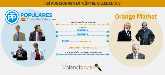Según las declaraciones, el PP obligó a los responsables de Orange Market a facturar en B y a emitir facturas falsas en favor de otros empresarios cercanos a la formación política. Si todos apuntaron a Ricardo Costa, "El Bigotes" fue más allá, y señaló al propio Francisco Camps, expresident de la Generalitat, como la persona que daba las órdenes a la trama. No obstante él no está imputado.