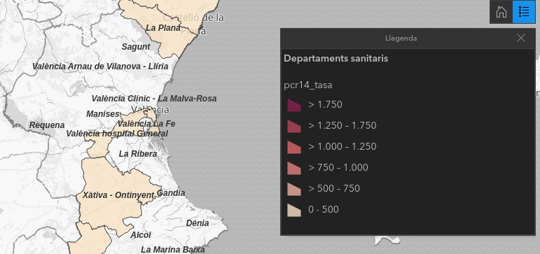 Los 11 departamentos de salud que conforman la provincia de València suman una media de incidencia inferior a la autonómica con 208,8 casos por cada 100.000 habitantes frente a los 224 casos por cada 100.000 habitantes.Rondando esta cifra hay cuatro áreas, tres de ellas por encima: València Clínic – La Malva-rosa tiene 773 positivos en 14 días y 223,56 contagios por cada 100.000 habitantes; València – Arnau de Vilanova – Llíria tiene 702 positivos en 14 días y 219,52 contagios por cada 100.000 habitantes; Sagunt tiene 325 positivos en 14 días y 212,42 contagios por cada 100.000 habitantes; y Manises cuenta con 390 positivos en 14 días y 188,21 contagios por cada 100.000 habitantes.