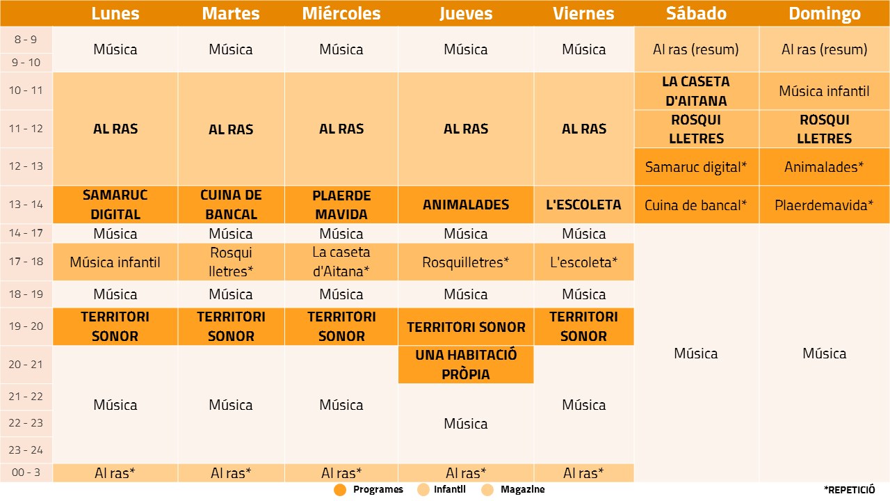 La programación de la emisora autonómica, que emite a través de los diales 102.2 FM (València), 96.5 (Alicante) y 102.7 (Castellón), no contempla inicialmente servicios informativos. La razón primordial es que aún están incorporándose los primeros trabajadores. Y, además, el edificio de Burjassot todavía está en obras para incorporar la redacción integrada propuesta por la directora, Empar Marco.Se dedicarán 28 horas de programación repartidas en 10 programas a lo largo de la semana. El más esperado es sin duda el magacín diario matinal dirigido por la periodista Jèssica Crespo. Se llamará "Al ras" y se centrará en asuntos culturales y sociales, una primera toma de contacto con la sociedad valenciana.Por otra parte, la otra voz destacada recién confirmada por la corporación es Amalia Garrigós. Ella fue una de las periodistas que abrió la anterior RTVV y fue la última voz de Radio 9 la noche de su cierre. Ahora vuelve con un programa dedicado a la música, llamado "Territori sonor", que nos acompañará todas las tardes de 7 a 8.También la literatura tendrá su hueco, en los espacios "Plaerdemavida" y "Una habitació pròpia", presentados por Maria Josep Poquet y Irene Rodrigo respectivamente. Este segundo focalizará la atención en la literatura más juvenil. Joan Espinosa, por otra parte, trae el programa "Animalades", un espacio dirigido a toda la familia que hablará del mundo animal."Cuina de bancal", llevado por Carles Galletero, nos traerá lo mejor de la gastronomía de las comarcas, y "Samaruc digital", de Reis Juan, nos mostrará la riqueza medioambiental del territorio valenciano.Los más pequeños también son parte de este proyecto. Y es por eso por lo que "L'Escoleta" y "La caseta d'Aitana", dirigidos por Aitana Ferrer, ofrecerán planes para toda la familia. En este sentido también, Rafa Albert conducirá "Rosquilletres", un concurso lingüístico en valenciano.