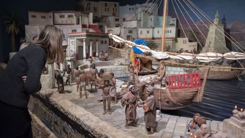 El recorrido por el belén permite adentrarse en tres grandes escenarios —Nazaret, Belén y Egipto— recreados con una fidelidad histórica que impresiona tanto por su escala como por la delicadeza de los detalles: desde los mosaicos del palacio de Herodes hasta las 95.000 hojas de latón del gran árbol del Empadronamiento. La vegetación mediterránea, los barcos del puerto egipcio, las jaimas del desierto o los juegos infantiles del Israel antiguo completan una escena que traslada al visitante a hace más de dos mil años.