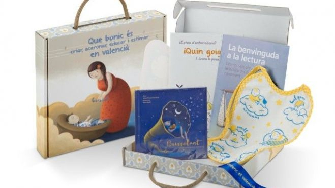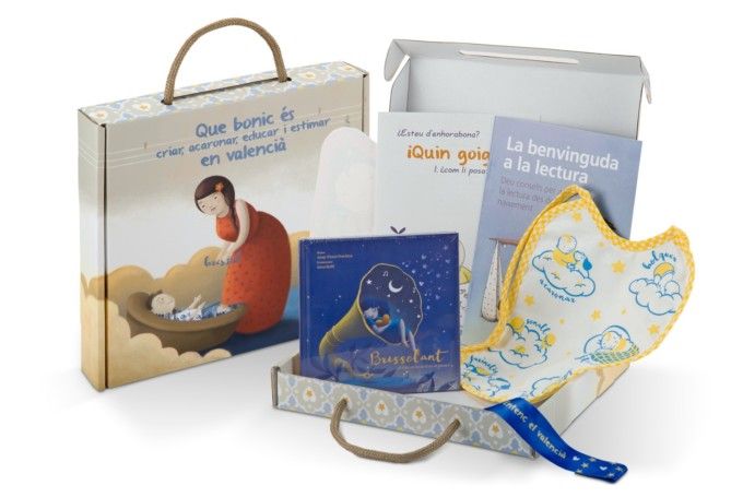 La preciosa y emotiva cajita contiene para el disfrute de los padres y el bebé un babero, una tira para el chupete y una pegatina para el coche. Además de un cd de canciones de cuna tradicionales y en valenciano, diferentes consejos para poner el nombre en valenciano, fomentar la lectura en valenciano y recuperar las palabras ligadas a los primeros meses de vida. Los diseños, tanto de la caja como del léxico del bebé han sido diseñados por Irene Bofill.