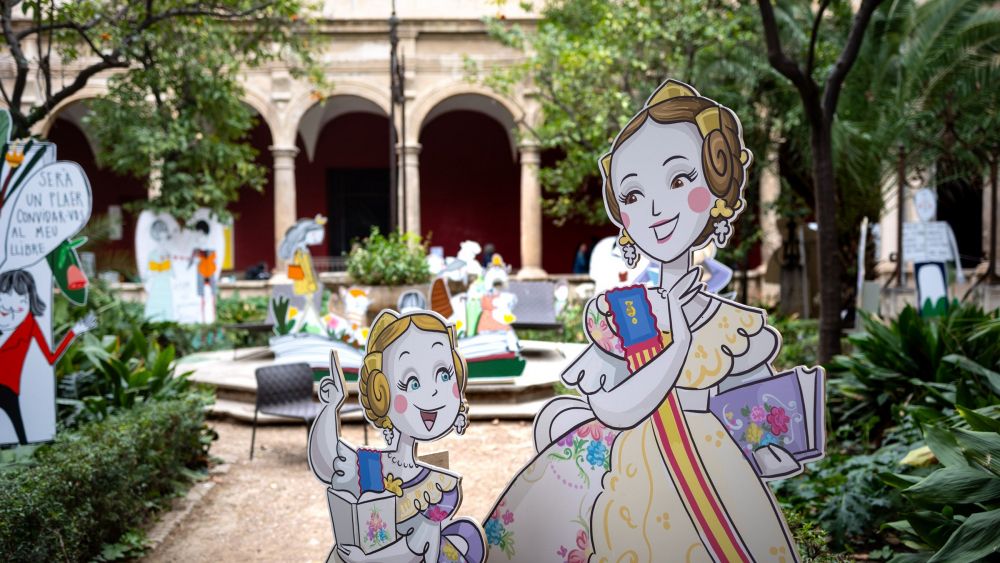 Entre la vegetación del claustro del antiguo convento, emerge una galería de personajes que representan escenas vinculadas con la lectura y enlazan con el imaginario del monumento municipal infantil, que gira en torno a la capitalidad verde europea de València de este 2024.