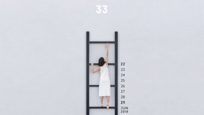 El motivo principal del cartel de este año de Cinema Jove es la figura de una mujer de espaldas, en plena subida de una escalera vertical, a punto de alcanzar el último peldaño con la punta de los dedos. En paralelo, y también en vertical, se desgranan las fechas de celebración del festival de cine, del 22 al 29 de junio.