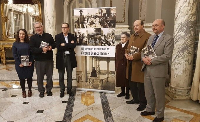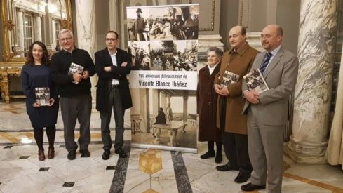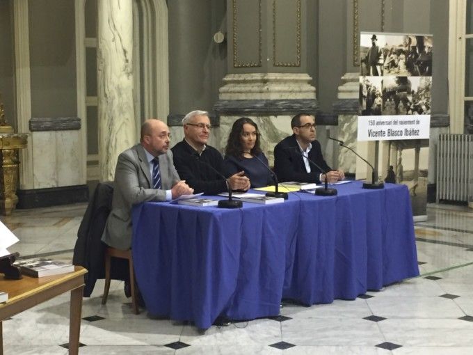 El alcalde, Joan Ribó; la concejala de Cultura, Glória Tello; el presidente de la Fundación Centro de estudios Blasco Ibáñez, Ignacio Soler Serrano y el coordinador del libro Emilio José Sales han inaugurado el Año Cultural con la presentación del libro redactado por la hija del escritor.