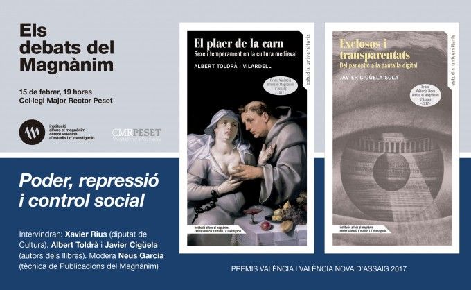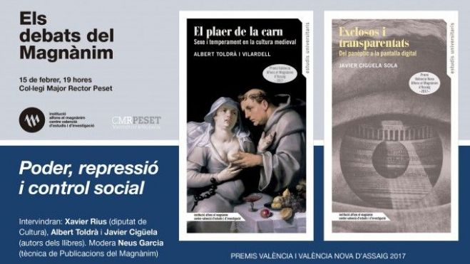 El 15 de febrero, la Institució Alfons el Magnànim-Centre Valencià d’Estudis i d’Investigació, dependiente del área de cultura de la Diputació de València, organiza una nueva edición de Els Debats del Magnànim, con los ganadores de los Premios València de Ensayo del 2017: Albert Toldrà i Vilardell y Javier Cigüela Sola. El acto, conducido por Neus Garcia Vidal, técnica de publicaciones del Magnànim, y con la asistencia del diputado de Cultura, Xavier Rius, servirá para debatir alrededor del Poder, repressió i control social, elementos muy presentes en ambos libros. Toldrà presentará El plaer de la carn. Sexe i temperament en la cultura medieval, obra ganadora del Premio València de Ensayo en la última edición de los galardones de la Institució; y Cigüela hará lo propio con Exclosos i transparentats. Del panòptic a la pantalla digital, que obtuvo el València Nova, premio para menores de 31 años. El evento tendrá lugar en el Colegio Mayor Rector Peset, de la Universitat de València, a las 19’00 horas. La entrada será libre y gratuita.