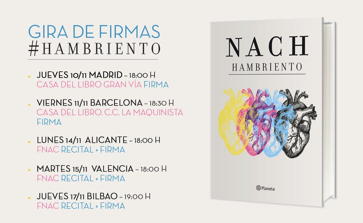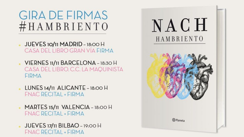 Este libro de poesía, género que para Nach es “como un néctar, que es la proporción perfecta de letra y matemática, que es la porción más erótica de la gramática”, se construye como un conjunto de poemas sin música, sin melodía, en los que trabajó durante cuatro años, el reflejo de su vida y la convivencia con la soledad y el reto del autoconocimiento. Su influencia ha crecido gracias a sus lecturas y a los artistas con los que ha colaborado, entre ellos, Ismael Serrano.El rapero es una estrella a nivel mundial. En sus redes sociales tiene a miles de seguidores (solo en Facebook, 1.800.000 likes), y es oído en países de toda Latinoamérica como México, Argentina o Chile. En España presentará su libro en una gira de recitales y firmas por Madrid, Barcelona, su natal Alicante, Bilbao y, por supuesto, Valencia.El martes 15 de noviembre Nach se presentará en Fnac San Agustín, en una ocasión en la que mostrará su obra y acompañará a sus seguidores en un viaje íntimo por su poesía.A veces mi soledad quiere vomitarsecomo una resaca,como una metástasis con la formade todas las plagas medievales.
