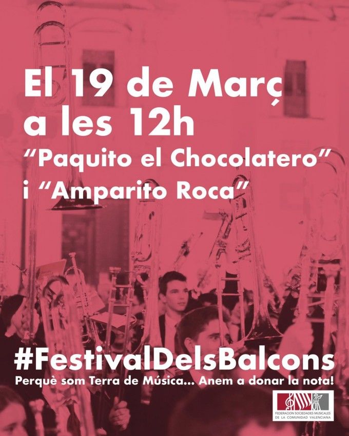 El pasado jueves, 19 de marzo, València fue testigo de un día de San José muy diferente, sin fallas ni cremà, pero con mucha implicación ciudadana y ambiente festivo a pesar de todo. Eugeni Alemany, junto con el cómico Raúl Antón y la Federación de Sociedades Musicales de la Comunitat Valenciana (FSMCV), pusieron en marcha la iniciativa #FestivalDelsBalcons, que nació a raíz de ver en Twitter las propuestas de la gente en los ventanales de sus casas durante la cuarentena. El objetivo era que todas las personas que tocaran instrumentos musicales o, simplemente, quisieran participar, salieran a sus balcones a tocar los pasodobles «Paquito El Chocolatero» y «Amparito Roca» a las 12 horas.