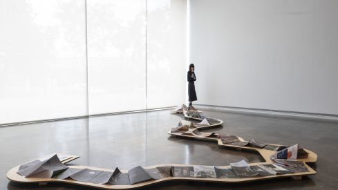 En otra parte de la sala sobresalen unas esculturas colgantes de gran formato realizadas con redes de pesca de las comunidades locales. De esta manera, a través de su estudio y de su trabajo de campo con comunidades afectadas por grandes infraestructuras y otros proyectos extractivos, “contribuye a la construcción de una memoria ambiental como espacio imprescindible para el clima y la justicia social”, declaró la comisaria.