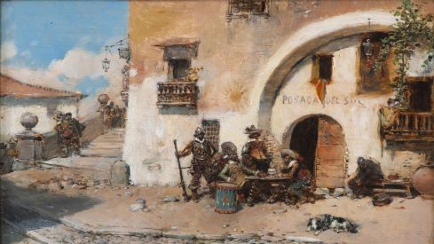 «En la Posada del Sol» (13x19,5 cm): Enmarcada en la corriente de la pintura de «casacón», esta pieza presenta a varios soldados vestidos a la usanza del siglo XVIII. La escena transcurre en una pequeña plaza junto a una casona con un arco de medio punto cegado, identificada por un letrero como la «Posada del Sol». Delante de la entrada, cuatro figuras armadas con espadas y espingardas conversan animadamente. A la izquierda, una escalinata con barandilla de bolones añade profundidad, con otros personajes secundarios. Esta obra también fue subastada en Christie's, entonces con el nombre de «Fuera de servicio».