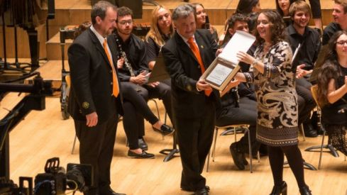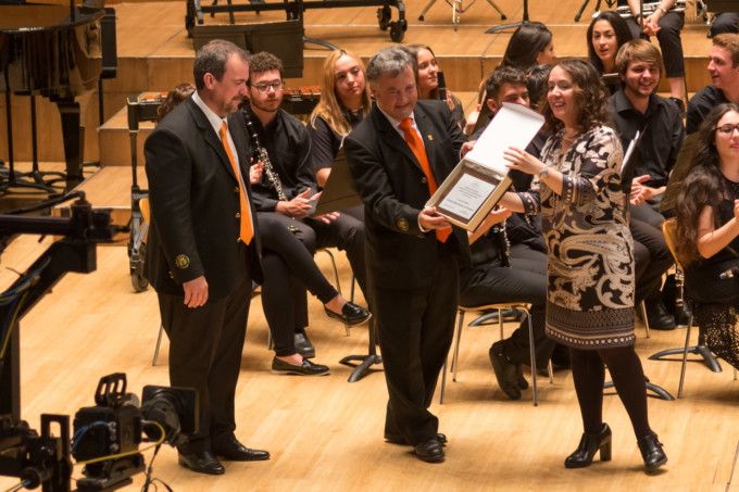 La presidenta del Palau de la Música y concejala de Cultura del Ayuntamiento de València, Glòria Tello, ha entregado el galardón a los ganadores, una banda compuesta por noventa músicos que han sido dirigidos por Víctor Soria.