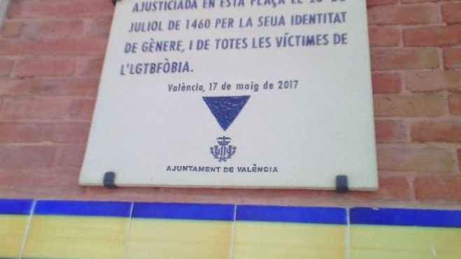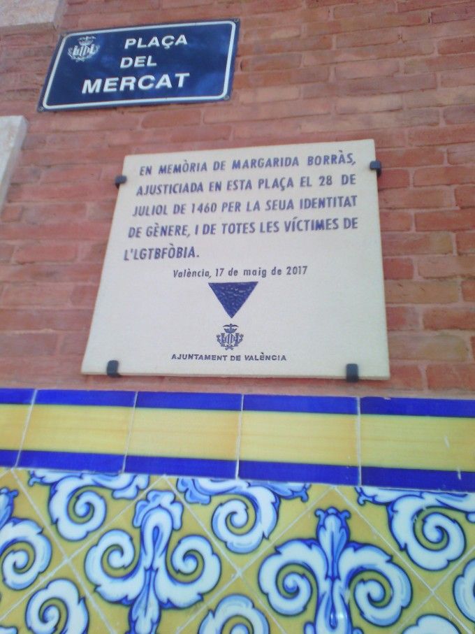 Una placa homenajea en la plaza del Mercat de València a Margarida Borràs desde el pasado 17 de mayo de 2017, Día Internacional contra la LGTBIfobia, por ser el primer caso documentado de tortura y muerte en València por identidad de género.