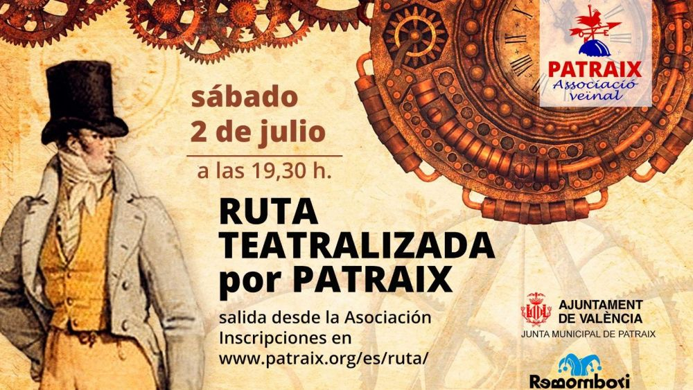 La Asociación Vecinal de Patraix, con la colaboración de Rebombori Cultural, ha organizado una ruta teatralizada por el barrio para el sábado 2 de julio. La ruta, que iniciará a las 19:30 horas en la Asociación, pretende mostrar los hitos históricos del barrio mediante actores que representarán la forma de vida de los distintos habitantes que han pasado por allí. Para poder participar en la visita, es necesario reservar plaza mediante un formulario de inscripción que se realiza en la página web de Patraix (patraix.org/es/ruta), de forma totalmente gratuita.