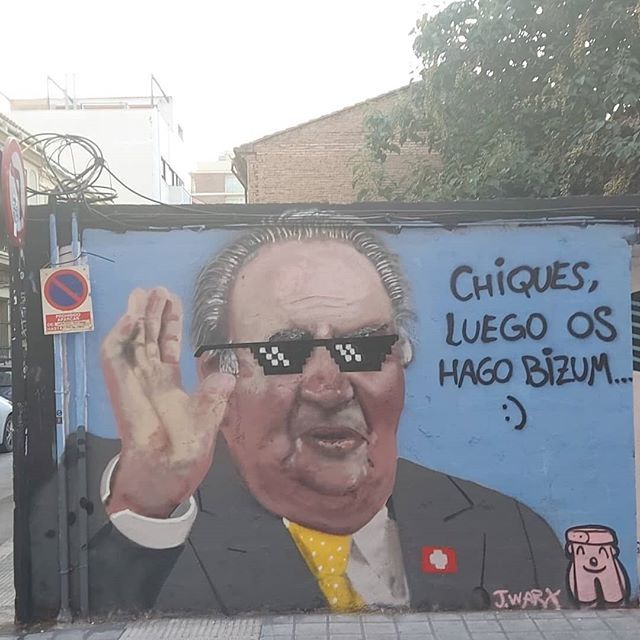 El artista de la obra, un gallego apodado ‘el Primo Banksy’ y del que no se conoce mucho acerca de él porque cuida su anonimato con recelo, ha representado así la situación actual del rey emérito. Una decisión que ha ocasionado que el exjefe de Estado sea protagonista de numerosos memes en las redes sociales y ahora de una obra urbana en Valencia. De hecho, hace unas semanas fue el protagonista de otro de los murales más virales de la actualidad, uno en el que aparecía en grande la cara del monarca y ponía al lado "corina real". Después, tras la salida repentina del exmonarca ha aparecido entrecomillado: "chiques, luego os hago bizum… :)" con unas gafas de thug life (unas negras pixeladas), ambos firmados por el artista J. Warx.