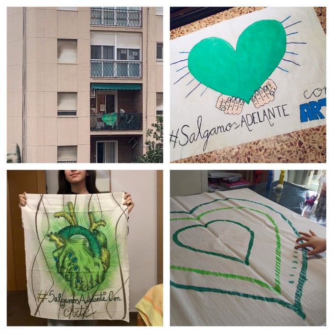 Desde el ámbito de la plástica, se están proponiendo actividades muy abiertas para que resulten accesibles a todo el alumnado, independientemente de los materiales disponibles en casa. Bajo esta misma premisa, #SalgamosAdelanteConArte se erige como otra iniciativa frente a la crisis del COVID-19 apta para todos los públicos, en la cual los únicos requisitos son trazar un corazón, pintarlo de verde esperanza y colgarlo, en las redes y en los balcones.