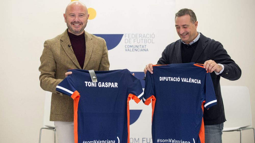 La Diputació de València y la Federació de Futbol de la Comunitat Valenciana (FFCV) han presentado este viernes en el patio dels Scala de la corporación provincial el acuerdo por el que, un año más, ambas entidades colaboran para promover el fútbol, especialmente el de base y femenino, en toda la provincia. El presidente de la Diputación, Toni Gaspar, y el de la FFCV, Salva Gomar, han explicado los detalles de un acuerdo por el que el área de Deportes que dirige Andrés Campos aporta 220.000 euros a la Federación.