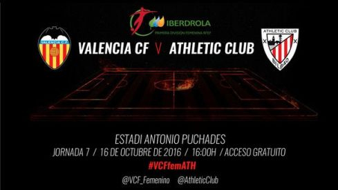 El Valencia CF Femenino recibe la visita del vigente campeón de Liga, el Athletic Club, mañana 16 de octubre de 2016, a las 16 hrs en el Estadi Antonio Puchades de la Ciudad Deportiva Valencia CF, en partido correspondiente a la 7ª jornada de la Iberdrola Primera División Femenina RFEF.