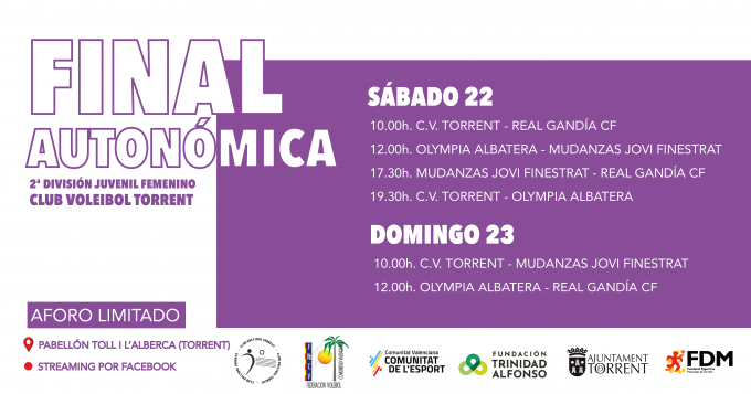 Torrent acoge este fin de semana la Final Autonómica de la categoría Juvenil Femenina del Club Voleibol Torrent. El equipo torrentino se jugará el ascenso a Primera Autonómica contra el Real Gandía CF, Mudanzas Jovi Finestrat y Olimpia Albatera. Los partidos se celebrarán en el Pabellón Toll i L’Alberca de Torrent con aforo limitado y se retransmitirán en directo por la página de Facebook del Club Voleibol Torrent.