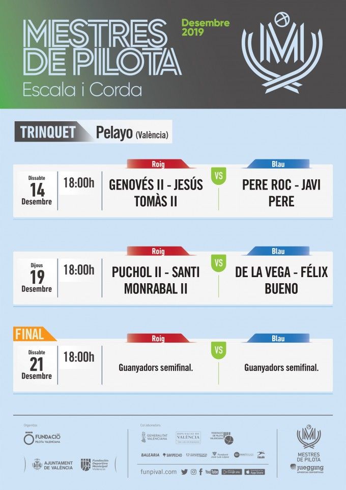 En el Trofeu Mestres de la Pilota – Gran Premi Juegging participarán un total de cuatro equipos, todos ellos tríos, que han sido configurados según el ránking oficial con los pilotaris que han logrado los mejores registros durante el 2019. El formato constará de tres jornadas, dos para las semifinales y una para la final.Las semifinales tendrán lugar los días 14 y 19 de diciembre, mientras que la gran final, que será retransmitida por À Punt, se llevará a cabo el sábado 21 de diciembre. Tanto las semifinales como la gran final se iniciarán a las 18:00 horas. En la primera semifinal, el trío compuesto por Genovés II, Jesús y Tomás II se enfrentará al de Pere Roc II, Javi y Pere. En la segunda, el trío formado por Puchol II, Santi y Monrabal II se medirá a De la Vega, Félix y Bueno. Además se han programado partidas de juveniles previas tanto a las semifinales como a la final a partir de las 16:30 horas.
