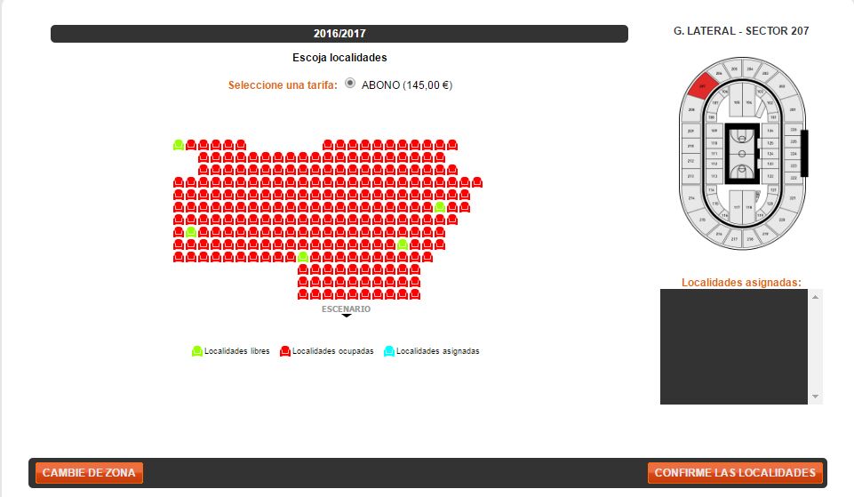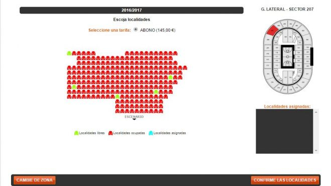 Los más económicos (Fondo N y S) de 125€ por abono están agotados. De la Grada Lateral a 145€ quedan un total de 21 asientos y de ellos entre 1 y 5 asientos libres según el sector. Pero, según marca la web cuando intentas comprar el abono, no están los asientos juntos. En la zona de Canasta a razón de 160€ el abono, tampoco quedan ya asientos libres. En las zonas de Preferente N y S suman 10 asientos libres pero tampoco son continuos. En Tribuna Curva y Lateral, pese a ser más caras (285€ y 560€ respectivamente) tampoco se puede adquirir asientos conjuntos. Sin embargo, en la zona más caras sí quedan algunos asientos juntos como ocurre en la Tribuna Central (695€) en la que aún hay 30 abonos para vender.