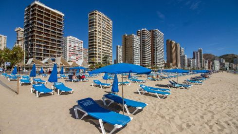 Sombrillas y tumbonas en la Playa de Levante de Benidorm