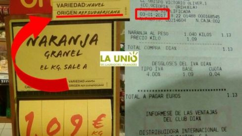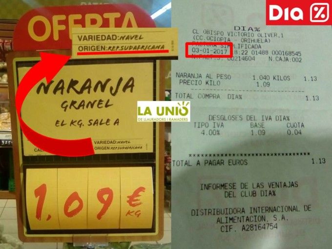 Tanto en tiendas físicas (como se puede ver en el tique de compra de ayer de un supermercado Dia de Orihuela (Alicante) y otro de hoy en Pozuelo de Alarcón en Madrid), como en la tienda online a nivel estatal se pueden adquirir naranjas de la variedad Navel a 1,39 euros/kg cuyo origen es la República Sudafricana.