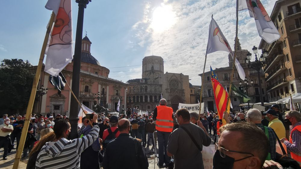El sector primario pide ayuda. Este mediodía labradores y agricultores han realziado una manifestación por las calles del centro de València para reclamar ayudas por los daños que sufrido el campo tras las últimas plagas y piden que Europa defienda sus intereses. La convocatoria, que ha finalizado en la plaza de la Virgen, ha concentrado a multitud de representantes de colectivos del sector primario de diferentes puntos de la Comunitat Valenciana.