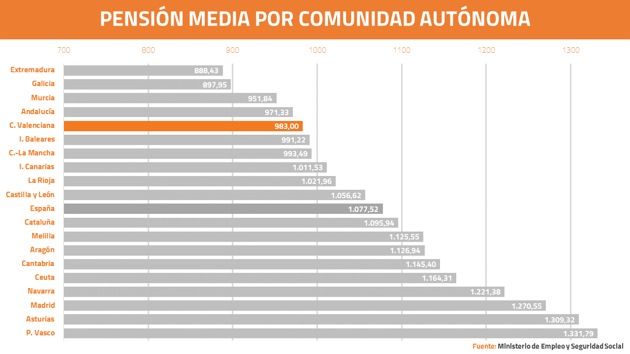 La brecha entre las autonomías con mejores pensiones y las que perciben pensiones más bajas se calcula en 450 euros aproximadamente. Justo por detrás del País Vasco se encuentran Asturias (1.309 euros), Madrid (1.270) y Navarra (1.221). Las que menos reciben, por encima de Extremadura, son Galicia (897), Murcia (951) y Andalucía (971). Y a continuación, la Comunitat Valenciana, que se encuentra casi 100 euros por debajo de la media estatal, cifrada en 1.077 euros.