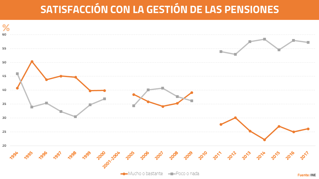 Y es que la gestión del sistema de prestación por jubilación nunca ha sido de los mejores valorados en España. De todos los estudios, solo en 1995 más del 50% de los encuestados afirmaron estar bastante o muy satisfechos con él. Pero fue a partir del estallido de la crisis económica cuando el descontento empezó a hacerse de notar. En 2014, casi 6 de cada 10 estaban poco o nada satisfechos con la gestión de las pensiones. En 2017 se relajó, pero aun así el 57% seguían pensando igual.