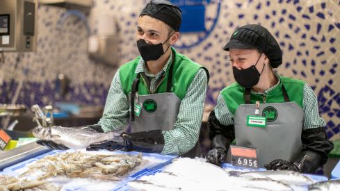 Trabajadores en la sección de Pescadería de un supermercado Mercadona
