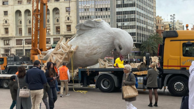 La plaza del Ayuntamiento ya alberga parte de la falla municipal, una obra diseñada por Escif y realizada por Pere Baenas, titulada 'Dos palomas, una rama'. Este lunes, el artista descargó las primeras piezas, dos palomas de grandes dimensiones que conforman el núcleo central de este impresionante proyecto, y se puede contemplar, también, el pato de grandes dimensiones que llegó el sábado durante la Cavalcada del Ninot.