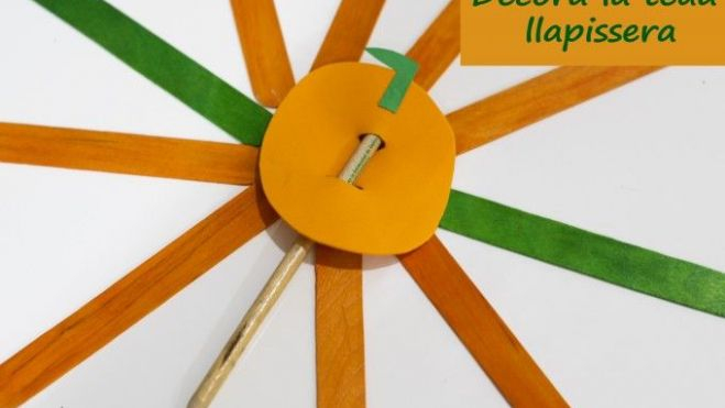 4) Ya puedes introducir el lápiz por los cortes y ver cómo queda la naranja sobre él. Para darle el toque final, dibuja el tallo y la hoja de la fruta en la cartulina verde. A continuación, recorta esta pieza y pégala con pegamento sobre la naranja, en la parte de arriba. Pon pegamento solo en el tallo, que es la parte que irá adherida al círculo.