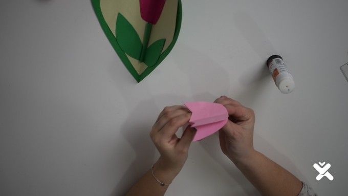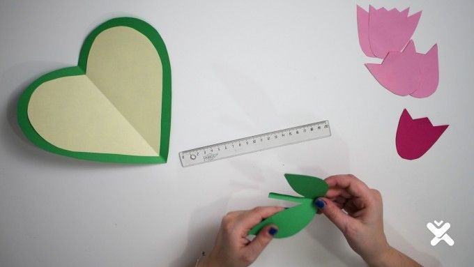 3) Lo pegamos todo, dejando las flores para el final: el corazón pequeño dentro del más grande. Sobre el pequeño, en la parte de abajo, pegamos el tallo con las hojas.