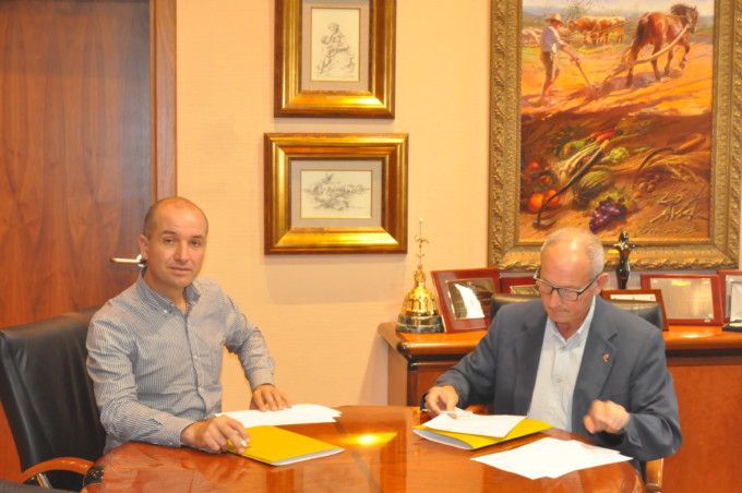 El presidente de AVA, Cristobal Aguado y el director de Valencia Activa y representante legal de Fet de Vidre, Javier Gonzalez Cardona han firmado un convenio de colaboración por el que la principal organización agraria valenciana adquirirá artículos de vidrio personalizados y específicamente confeccionados para ser repartidos como obsequio a las personas que asistan a actividades organizadas por la entidad agraria.
