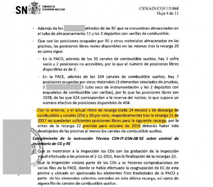 Con todo, el Consejo de Seguridad Nuclear (CSN), organismo dependiente del ministerio y encargado de gestionar la seguridad en las centrales y en el resto de instalaciones nucleares, avisó en una de sus actas de inspección de 2015 que con el ritmo al que se recargaba el reactor nuclear y se acumulaban residuos en la piscina -proceso que se realiza cada dos años-, "no quedarían suficientes posiciones libres" para la recarga de 2019.