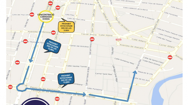 El recorrido pasará por las siguientes calles y puntos destacados del distrito marítimo: Llevant, Ermita, Plaça Mediterrània, Pont, Oltra, Rei, Joan XXIII, Gavina, Ponent, Cullera, Rei, Oltra, Pont, Plaça Mediterrània, Mare de Déu Blanqueta y final en el Centre Social Marcel·lí Pérez.