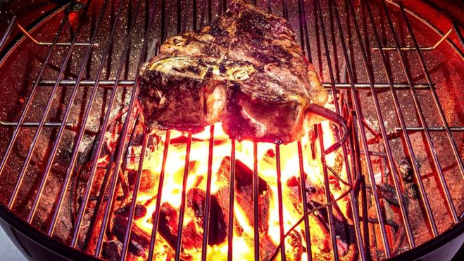 Un trozo de carne cocinándose a la brasa en el Meat Carnival de Valencia. Imagen: Meat Carnival