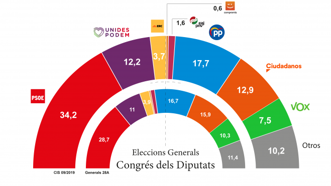 El bloque de izquierdas volvería a sumar mayoría en el Congreso de los Diputados y, además, la ampliaría. Son los datos que desprende el último Barómetro del Centro de Investigaciones Sociológicas (CIS), de septiembre de 2019. Sin embargo, las entrevistas para este estudio se realizaron en agosto, por lo que aún no queda reflejado el efecto de la candidatura de Íñigo Errejón, Más País, ni de la convocatoria de elecciones para el 10 de noviembre.
