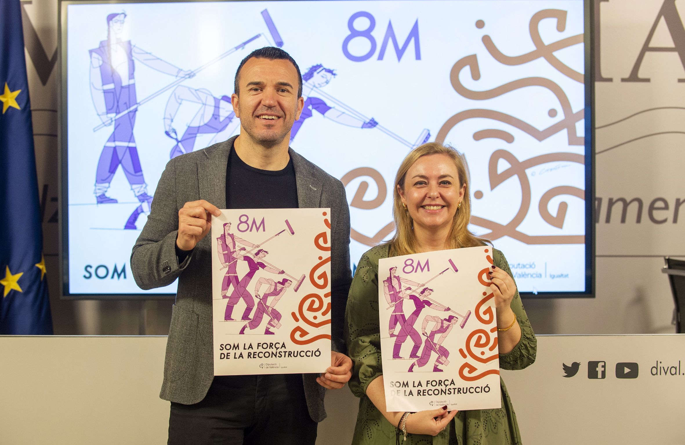 La Diputació de València que preside Vicent Mompó ha puesto a disposición de los ayuntamientos de la provincia su cartel para el Día Internacional de la Mujer, que bajo el lema ‘Somos la fuerza que reconstruye’ visibiliza la resiliencia y el coraje mostrado por las mujeres en el proceso de recuperación tras la dana. La campaña visual impulsada por el área de Igualdad que coordina la vicepresidenta primera, Natàlia Enguix, se ha enviado a los consistorios para que aquellos que lo deseen puedan utilizarla, de forma personalizada, con las actividades programadas para el 8-M.