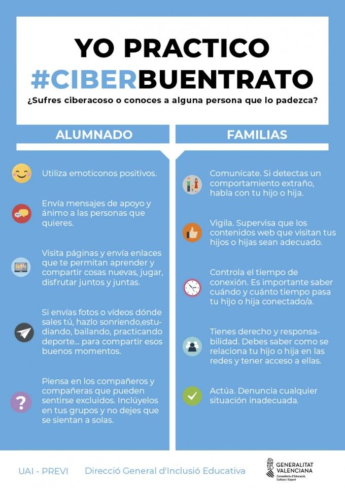‘Yo practico #CiberBuenTrato’ aspira a combatir el acoso en Internet mediante el uso de las buenas prácticas. Todo el material de la campaña se puede consultar en el nuevo espacio de inclusión educativa abierto en la página web de la Consellería (http://www.ceice.gva.es/va/web/inclusioeducativa).
