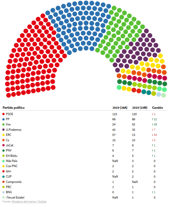 El PSOE ha ganado las elecciones generales de hoy con 120 escaños, pero ha fracasado con la repetición electoral ya que se ha estancado en porcentaje de votos y ha retrocedido tres escaños con casi el 95 por ciento escrutado. El resultado del resto de las fuerzas políticas no ayuda a que sume ni el bloque de la izquierda y ni el de la derecha para gobernar y además, ha propiciado que se acentúe el bloqueo. Así las cosas, las únicas salidas para formar gobierno son dos: o que Pedro Sánchez alcance un acuerdo con el PP o que pacte con Podemos y los independentistas.