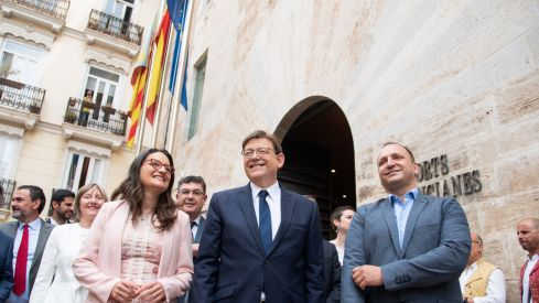 Tras la toma de posesión y aplausos en el hemiciclo valenciano, los tres socios de gobierno han hecho el tradicional 'paseíllo' desde el Palau dels Borja, sede de las Corts Valencianes, hasta el Palau de la Generalitat; un trayecto lleno de gente que animaba y daba la enhorabuena tanto a Puig como a Oltra y Dalmau.