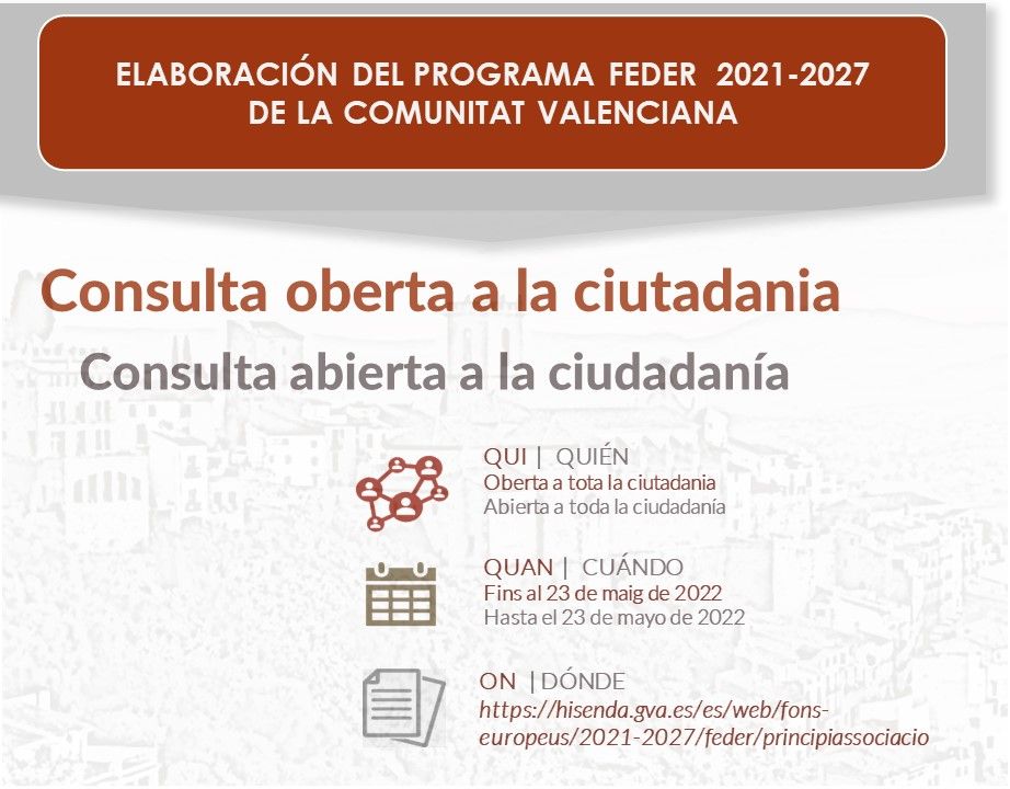 La Conselleria de Hacienda y Modelo Económico, a través de la Dirección General de Fondos Europeos, ha iniciado el proceso de consulta pública para la elaboración del Programa Feder 2021-2027 de la Comunitat Valenciana, que estará abierto a toda la ciudadanía hasta el próximo 23 de mayo.
