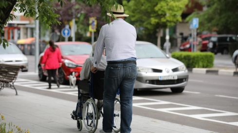 Un hombre pasea a una persona de edad avanzada en silla de ruedas